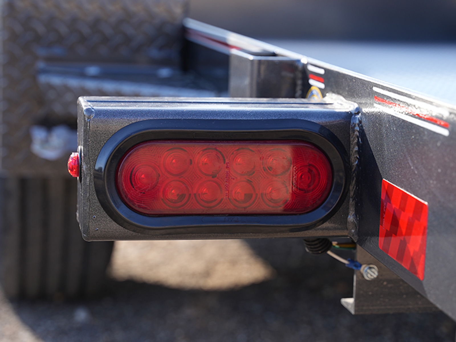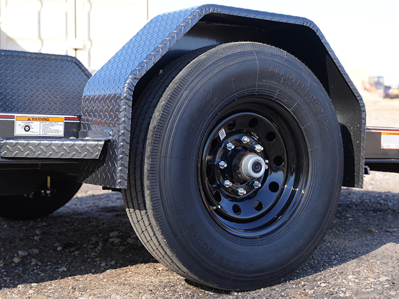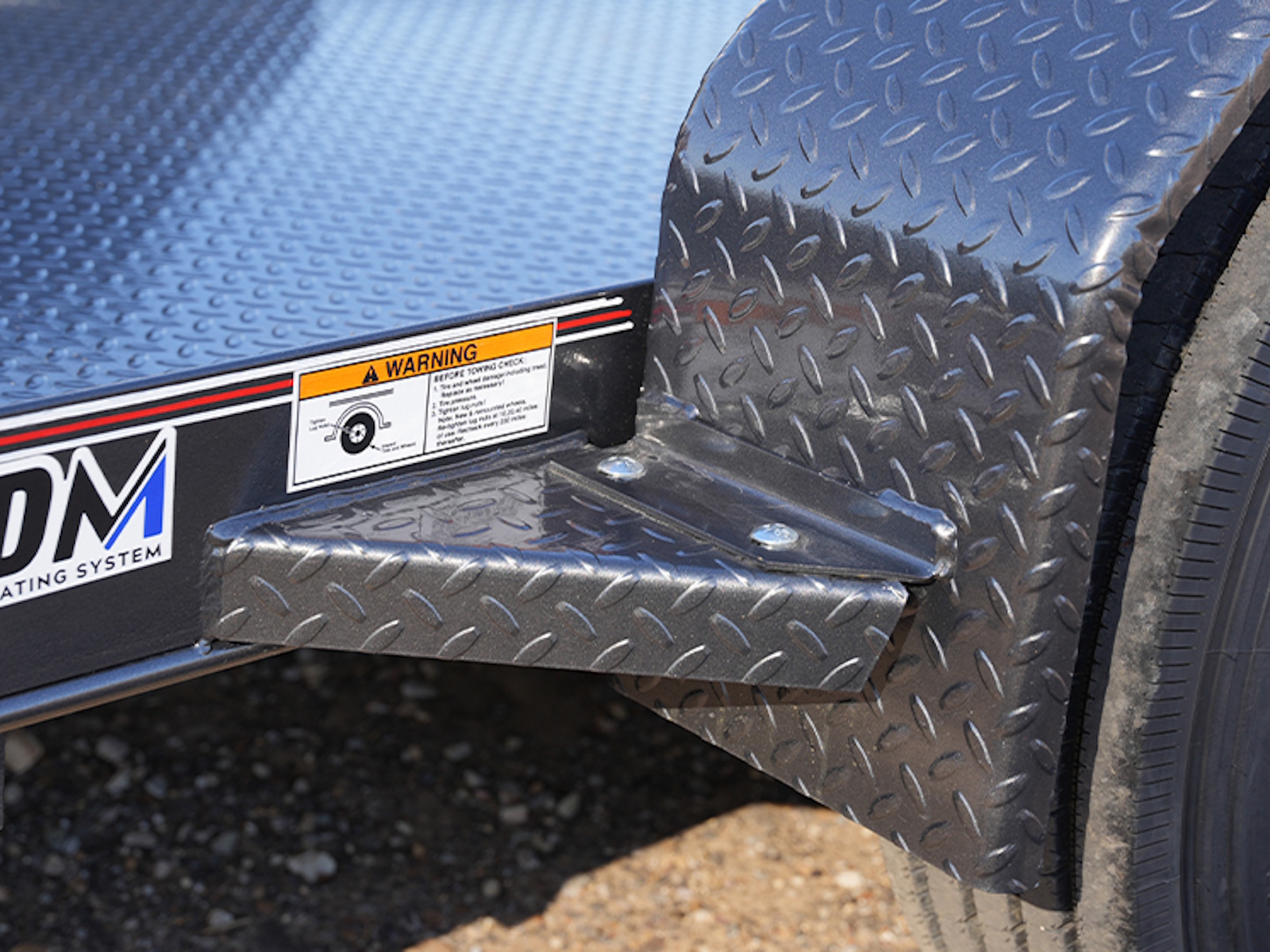 Equipment Tilt DSA107 L12x77, 1-7K Elec. Brake Axle, 2-5/16" Adj. Demco Coupler, 4 - 1/2"D-Rings, Hydraulic Dampened Gravity Tilt, 1/8" Diamond Plate Floor, Rub Rail & Stake Pockets, 14GA. Bolt-On Fenders, ST235/80R16 14Ply Tires.