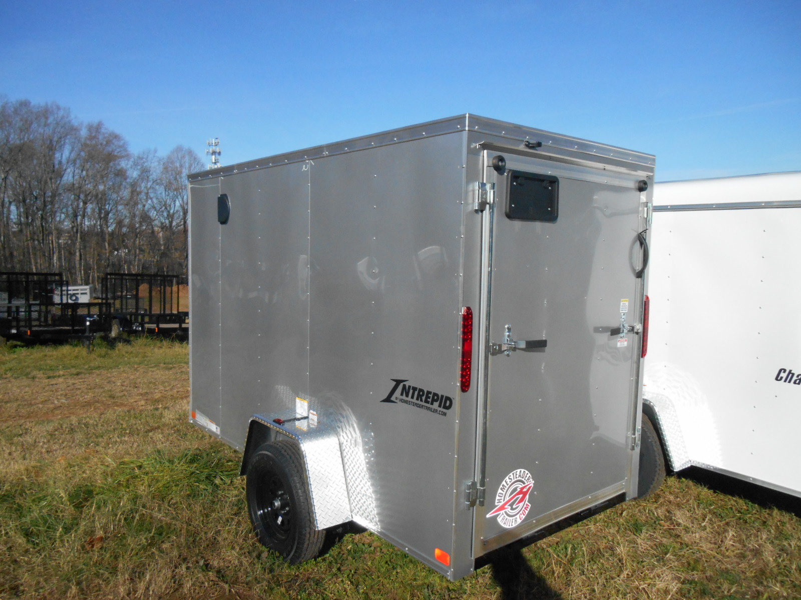 The Intrepid is an exciting series, packed full of standard features that are certain to turn heads! Standard features include, but are not limited to: 2′ Vee-Nose, 2′ Aluminum Tread plate Stone guard, 32″ Side Door, 6′6″ high sidewall on Tandem models, 6′ high sidewall on 6′ & 7′ wide Single axle models, 5’6″ high sidewall on 5′ wide models, Interior Light, 3,500 lb drop EZ Lube axles, Trailer Rated Radial Tires, Aluminum ATP Fenders, 3/4″ Exterior grade plywood flooring, and 3/8″ plywood lined interior walls.