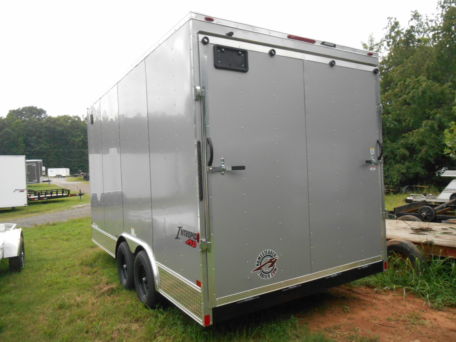 Intrepid HD series is built on a rigid 2×6 main frame. Floor cross members, tubular wall posts, and roof members are all 16” on center. Other standard features include 7’ interior height, .080 PolyCor siding, 5,200lb drop brake axles, 32” side entry door, rear ramp door with extension flap, rear loading and porch lights, and a 60” tongue with adjustable 2&5/16” coupler.
